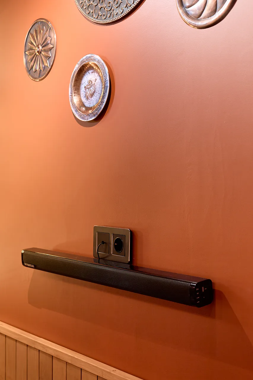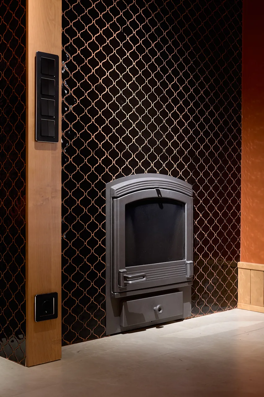 Особое внимание уделили освещению. В помывочной зоне смонтировали споты из алюминия, устойчивые к влаге, что гарантирует их долговечность даже в условиях высокой влажности. На потолке в зоне отдыха закрепили накладной шинопровод с четырьмя "умными" светильниками, которые позволяют регулировать освещение в зависимости от настроения и времени суток. Эти решения стали ключевыми для создания комфортной атмосферы.